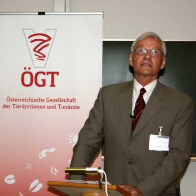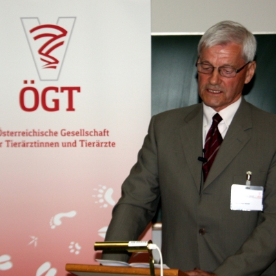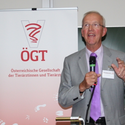 Dr. Harald Pothmann (ÖGT-Präsident) in einem gut besuchten Hörsaal die Veranstaltung. Die enge Verbindung der ÖGT mit der Vetmeduni Vienna, die Brücke zur Österreichischen Tierärztekammer (ÖTK) und die wichtige Kooperation mit der Industrie widerspiegelten sich in den Begrüßungsworten der